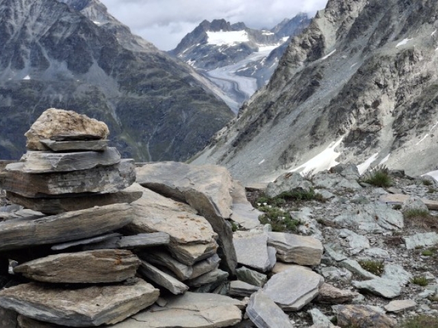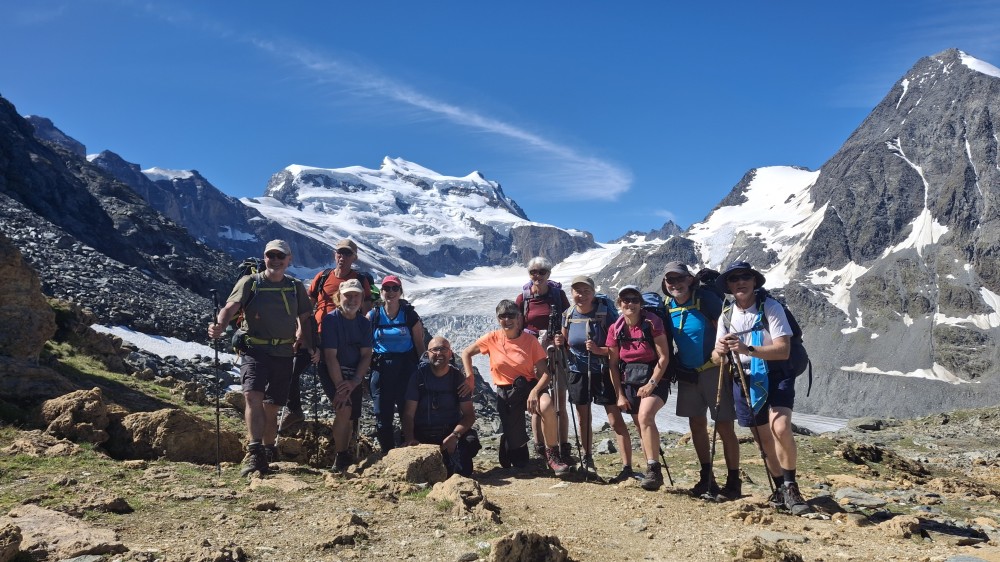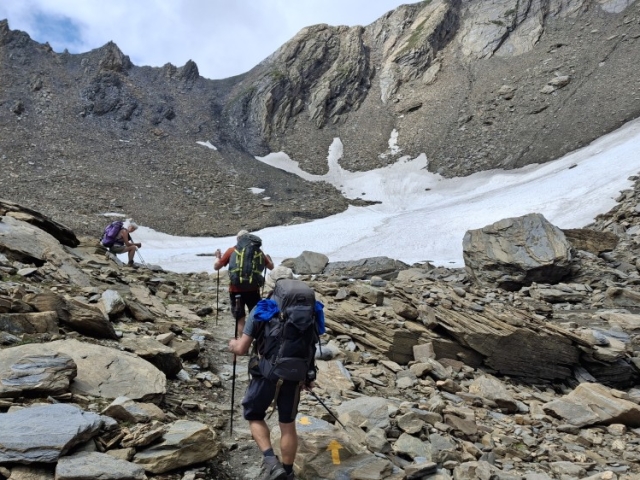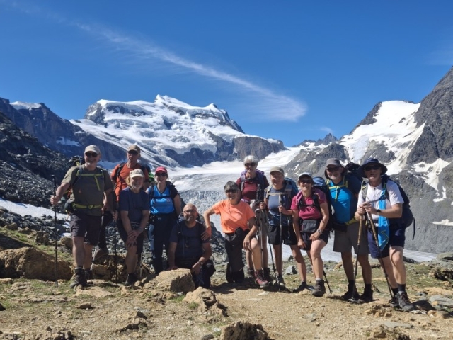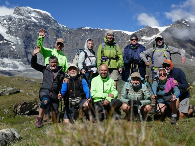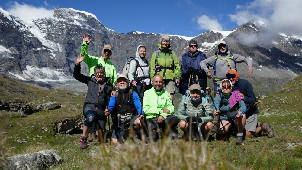 Mais restait le final avec le retour en Suisse par des cols à près de 2900m, très ventés et très froids. Alors qu’à Fontaine, la chaleur était accablante, nous marchions avec polaire, blouson, gants et bonnet. Mais le 6ème jour, quel spectacle ! Par une journée bien ensoleillée, le Grand Combin a crevé les quelques nuages. Enfin ! Nous l’attendions tous ! De son sommet descendait son glacier, grande langue de glace que nous avons côtoyée en marchant sur sa moraine. Le lendemain, un peu de stress en empruntant la passerelle de Corbassière, longue de 200 m et construite au-dessus du glacier avant qu’il ne fonde. Mais elle est toujours là pour passer d’un côté à l’autre de la montagne, se balançant sous nos pas. Nous passons un par un, pas très rassurés, il faut l’avouer.